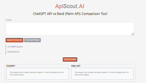 APIScout.AI lets you compare APIs of ChatGPT and Bard with a side by side response review, token and quota information, detailed API parameters for non developers and developers alike, and batch processing of large sets of prompts.