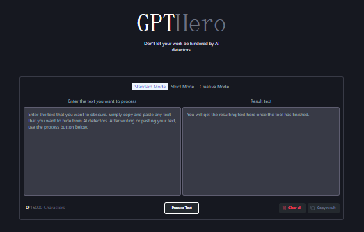 GPTHero is a free website focused on modifying text to bypass AI detectors. You can input any text and the algorithm modifies the text to obscure it and make it seem more human. We believe that GPT, like the internet, is a tool, and should be used to improve writing and research. AI detectors oppose this idea and focus more on preventing the use of GPT and other LLMs.